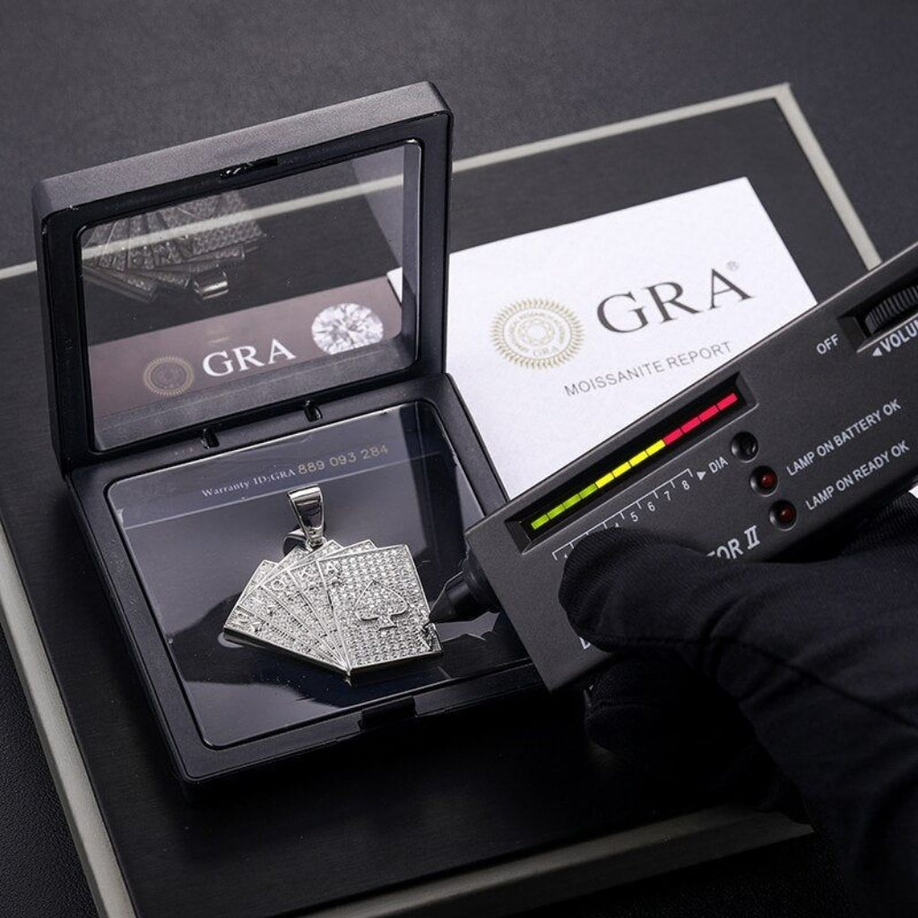 Celebrate luck and sophistication with the Royal Flush Moissanite Pendant, a standout piece inspired by the ultimate poker hand. Designed with D Grade Colorless moissanite stones, this pendant shines with unmatched brilliance and clarity, rivaling the finest diamonds.